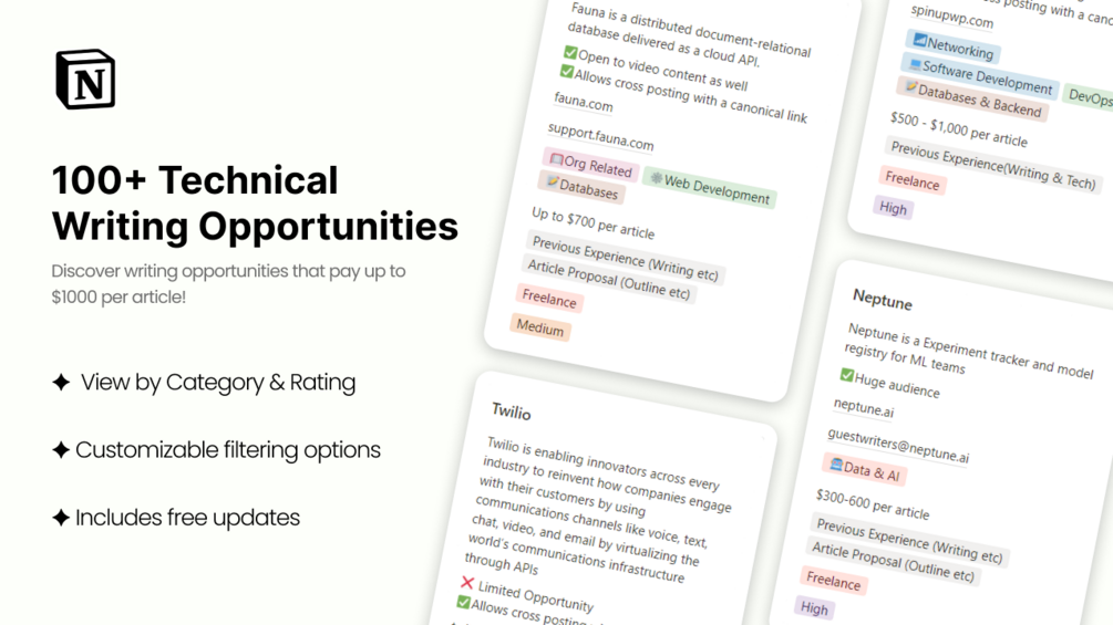 You'll get a Notion Template with 100+ Technical writing opportunities.